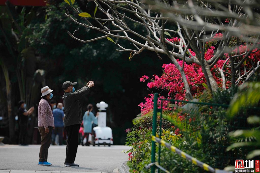 蓮花山公園一角,鮮花盛開,一位家長正為她的孩子拍照。