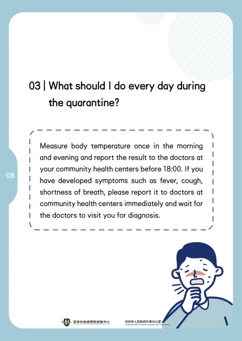 應(yīng)在早、晚各測(cè)量一次體溫,并于每天18∶00時(shí)前報(bào)告給社康醫(yī)生。如果出現(xiàn)有發(fā)熱、咳嗽、氣促等癥狀,應(yīng)立即向社康醫(yī)生報(bào)告,社康醫(yī)生會(huì)上門診斷。