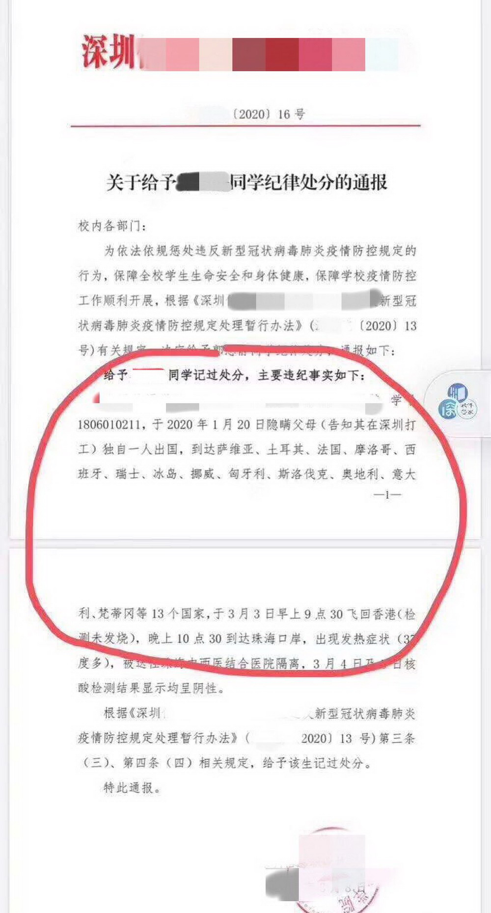 3月3日,小Y從珠海入境回國,在過海關(guān)時出現(xiàn)發(fā)燒癥狀并送往珠海中西醫(yī)結(jié)合醫(yī)院進(jìn)行隔離檢測?!霸谶^關(guān)的時候需要填寫旅行史,我如實填寫了,因為曾經(jīng)到過意大利等國家所以海關(guān)會重點監(jiān)測我。因為自身免疫力低,以及倒時差的原因,有些感冒低燒,但我也沒有隱瞞什么,如實闡述了我的行程和身體狀況,也很配合海關(guān)人員的調(diào)查?!?月4日、5日,當(dāng)事人核酸檢測結(jié)果均為陰性,由于違反定瞞報行程,小Y被學(xué)校予以記過處分。對于學(xué)校的處分決定,她坦言接受?!拔覜]有如實向?qū)W校匯報我的行程,我接受學(xué)校對我的處分?!?/p>