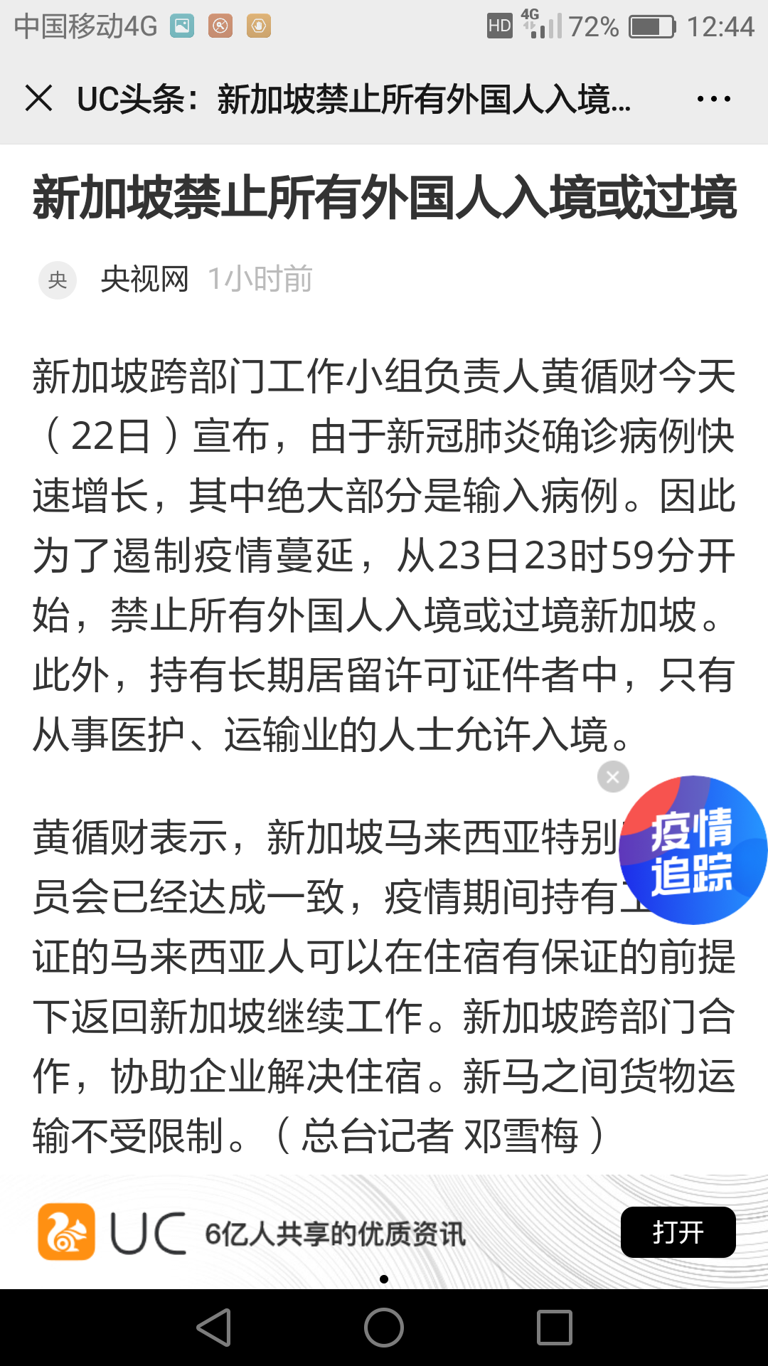 今日早些時候,據(jù)央視網(wǎng)報道,新加坡跨部門工作小組負(fù)責(zé)人宣布,為遏制疫情蔓延,從23日23時59分開始,禁止所有外國人入境或過境新加坡。同時,持有長期居留許可證件者中,也只有從事醫(yī)護(hù)、運輸業(yè)的人士允許入境。(記者蔡良煥)