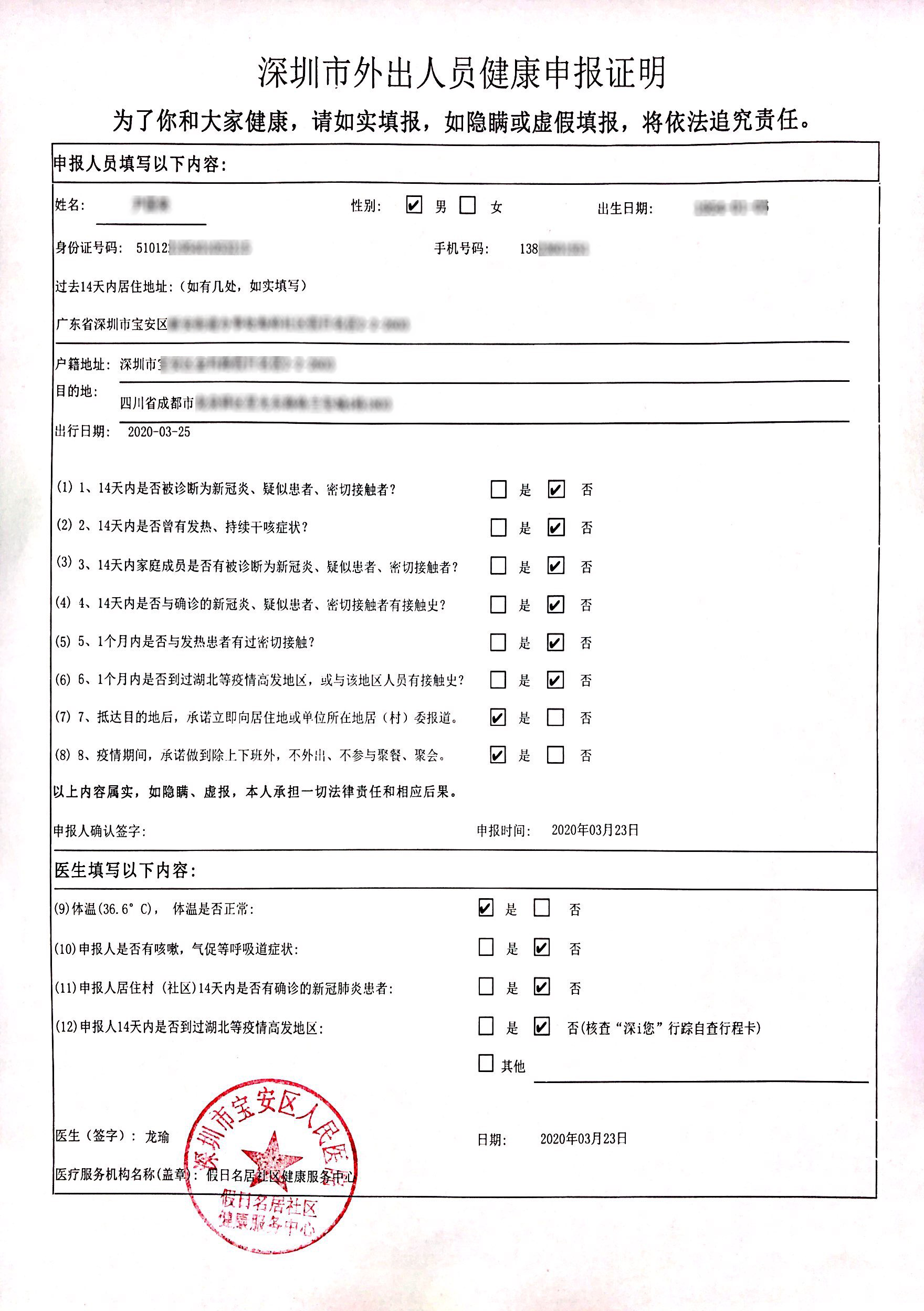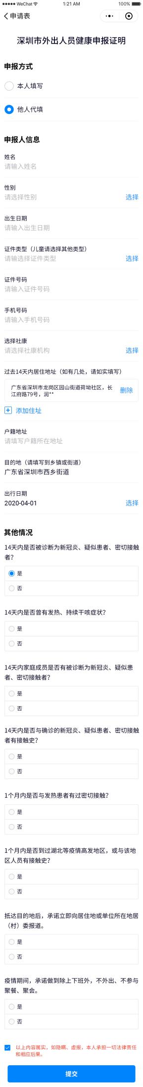為了保障疫情期間深圳市外出人員的有序正常出行,根據(jù)廣東省要求,疫情期間因出差、經(jīng)商、務(wù)工等原因需到外?。ㄊ?、區(qū) )的居民,如果出行目的地要求提供健康證明,可免費申請辦理《深圳市外出人員健康申報證明》。