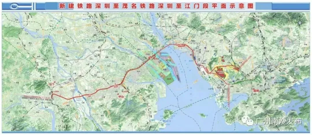 經(jīng)東莞市,在虎門鎮(zhèn)以隧道下穿珠江口,經(jīng)廣州市南沙區(qū)、中山市、江門市至深茂鐵路江門站。