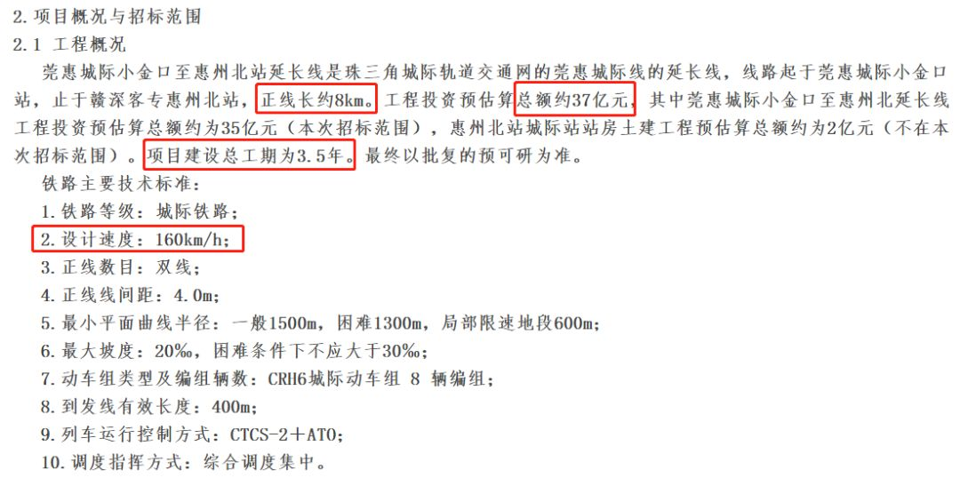 此間公示的莞惠城際小金口至惠州北站延長線,則是珠三角城際軌道交通網(wǎng)的莞惠城際線的延長線,線路起于莞惠城際小金口站,止于贛深客?;葜荼闭?,正線長約8km,設計速度為160km/h。工程投資預估算總額約37億元,其中莞惠城際小金口至惠州北延長線工程投資預估算總額約為35億元(本次招標范圍),惠州北站城際站站房土建工程預估算總額約為2億元(不在本次招標范圍)。
