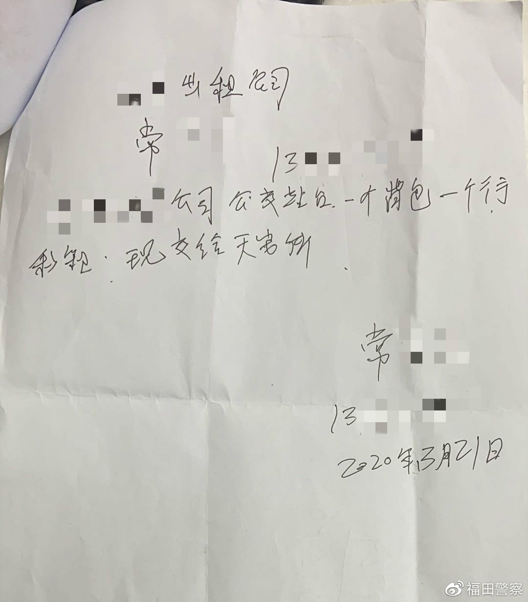 3月21日晚,一輛的士開(kāi)到深圳市公安局福田分局天安派出所門(mén)口,的士司機(jī)從車上拿下來(lái)一個(gè)黑色的背包和銀色的行李箱到前臺(tái)。