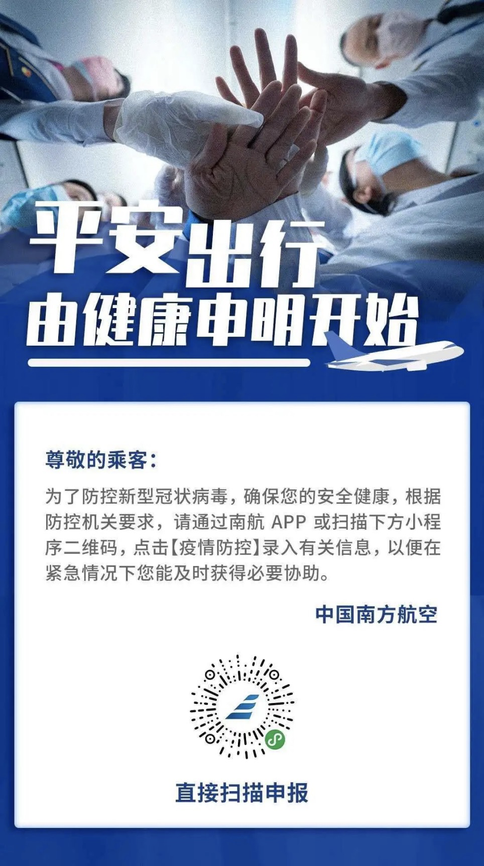 目前南航啟用“旅客健康申明”線上填寫,方便快捷,請自覺申報支持乘機(jī)疫情防控工作。