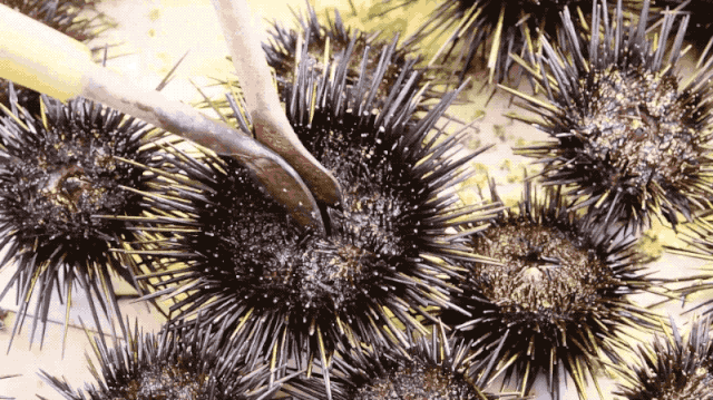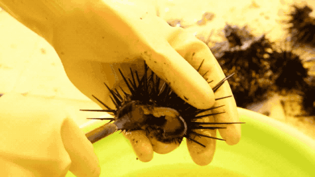 記者來到大鵬新區(qū)南澳海港路的潤成海膽專賣店,看到工人們上下飛舞著鐵鉤“挖海膽”。南澳本地人口中所謂“挖海膽”就是海膽加工,打開海膽殼,把海膽肉取出來,然后用海水清洗干凈。從捕撈到上岸加工處理都必須一天之內(nèi)完成,只有嚴守時間的把控,爭分奪秒才配擁有鮮美和誘人的口感。