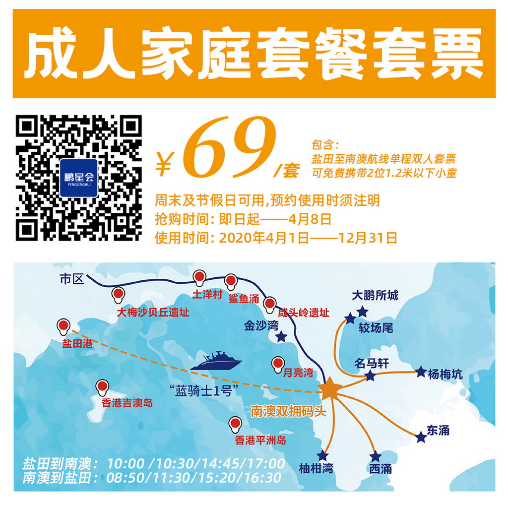 此外,即日起至4月8日,“鵬星會(huì)”專門推出69元“鹽田-南澳”航線家庭套票特價(jià)套餐搶購活動(dòng),套餐包含2位成人(可免費(fèi)攜帶2位身高1.2米以下小童)全航班單程船票,有效期為2020年4月1日至12月31日,周末及節(jié)假日均可使用,市民及旅客朋友可通過“鵬星會(huì)”公眾號(hào)下單搶購,搶購成功后,在出發(fā)前需至少提前1天以上致電4001020860預(yù)約,該套餐不接受出發(fā)當(dāng)天預(yù)約。