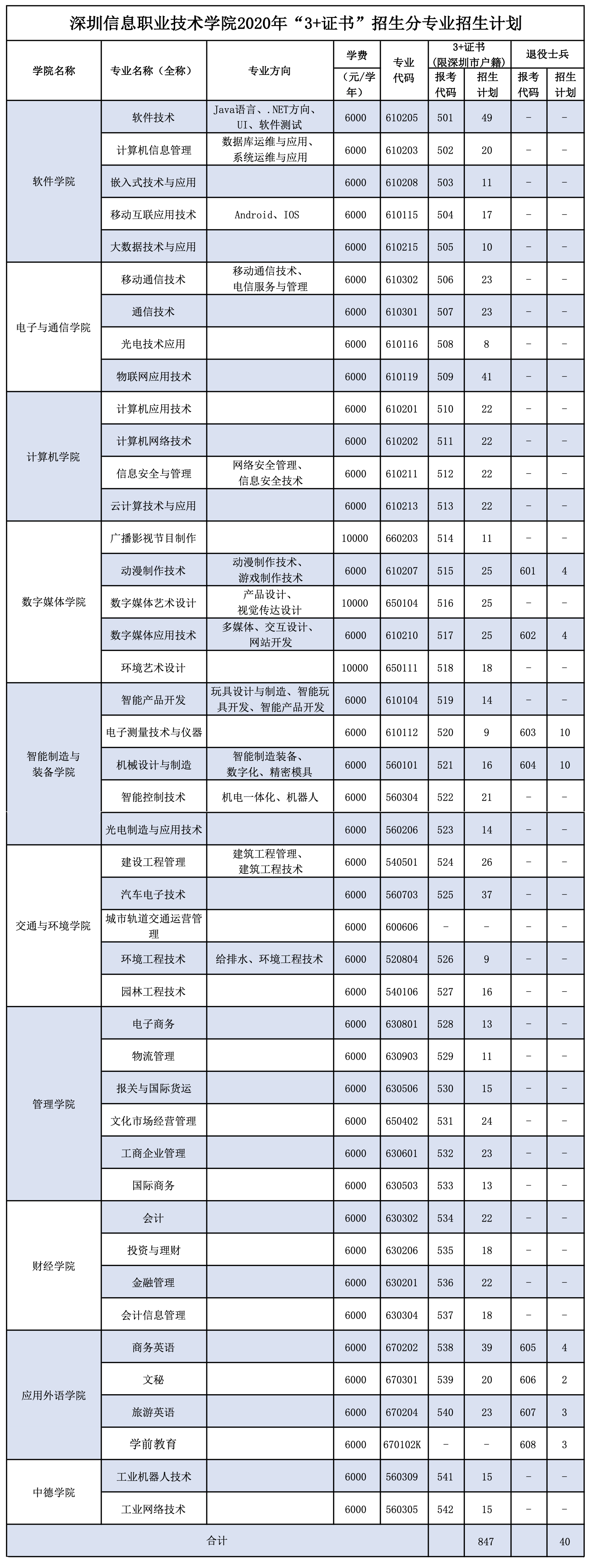 “依學考成績錄取”是深圳信息學院2020年春季高考招生重要形式之一,今年學校計劃招生2400人,面向文科計劃招生758人,理科計劃招生1514人,美術(shù)計劃招生128人。該校軟件學院、電子與通信學院、計算機學院、數(shù)字媒體學院、智能制造與裝備學院、交通與環(huán)境學院、管理學院、財經(jīng)學院、應(yīng)用外語學院、中德學院等10個學院均有招生計劃,招生專業(yè)共43個。