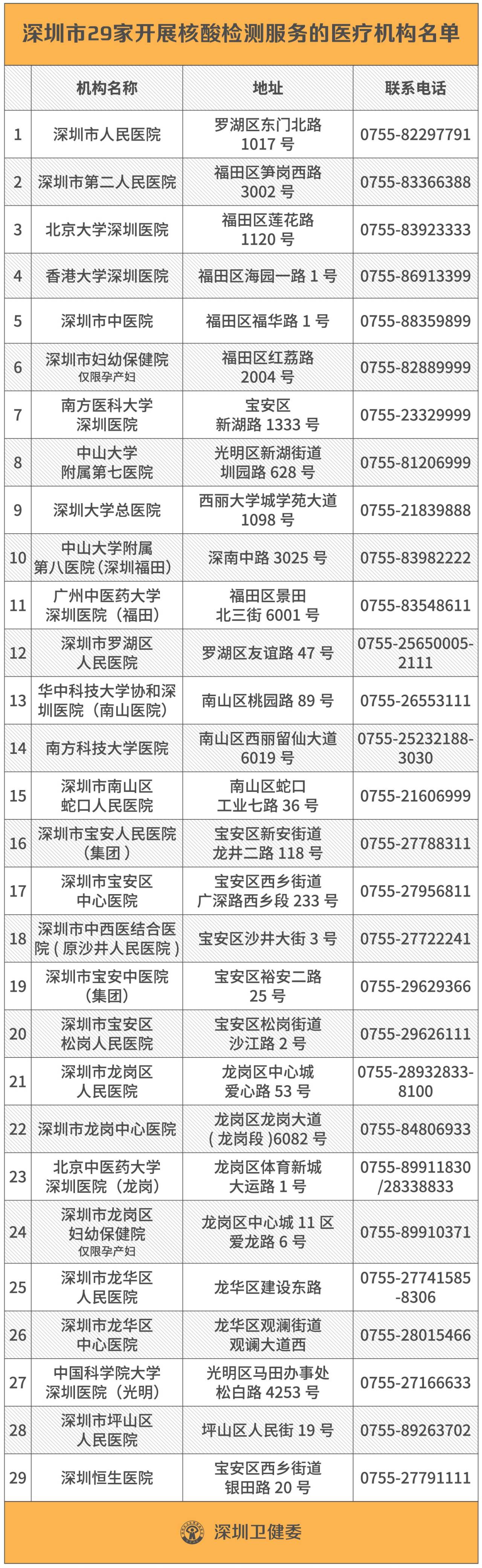 見(jiàn)圳客戶端·深圳新聞網(wǎng)2020年4月9日訊(見(jiàn)圳客戶端、深圳新聞網(wǎng)記者劉夢(mèng)婷 通訊員深衛(wèi)信)4月8日,武漢解封。但解封不等于解防,為了更好防控新冠肺炎,4月9日,深圳市衛(wèi)健委公布29家面向公眾開(kāi)展新冠病毒核酸檢測(cè)的醫(yī)院名單,如果市民擔(dān)心感染新冠肺炎,可前往檢測(cè)。