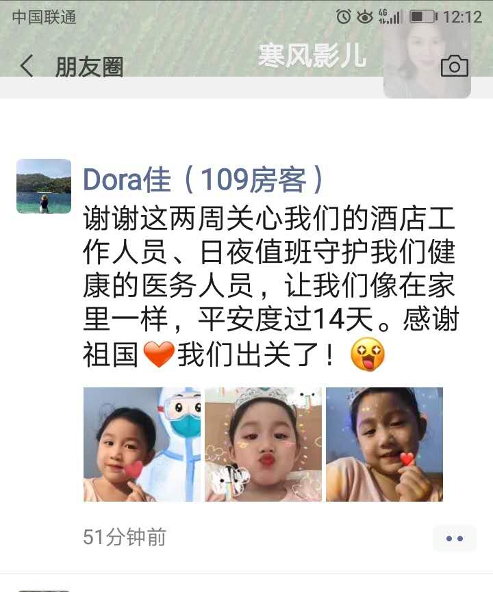 四是對確有特殊要求的隔離人員進行個性化服務。住213的某先生從文萊回國因家里原因在隔離期間情緒波動比較大,要求給他買10盒煙及啤酒,楊梅林了解到這一情況后,第一時間添加了客人的微信,只要一有空閑就找客人聊天并開導他不要有心理壓力,幾天下來,客人明顯開朗了很多,煙已經(jīng)很少抽了,啤酒一餐只喝一瓶,考慮到安全問題,每餐均被給楊梅林部分“退貨”了。還有401房單獨住了一位11歲的小女孩,劉群每天有空就給小朋友打電話,噓寒問暖,對入住酒店的特殊客人或帶小朋友的房間楊梅林和劉群服務的特別細致。她們常掛嘴邊的一句話是:隔離人不隔離愛,讓他們感受到家一樣的溫暖。