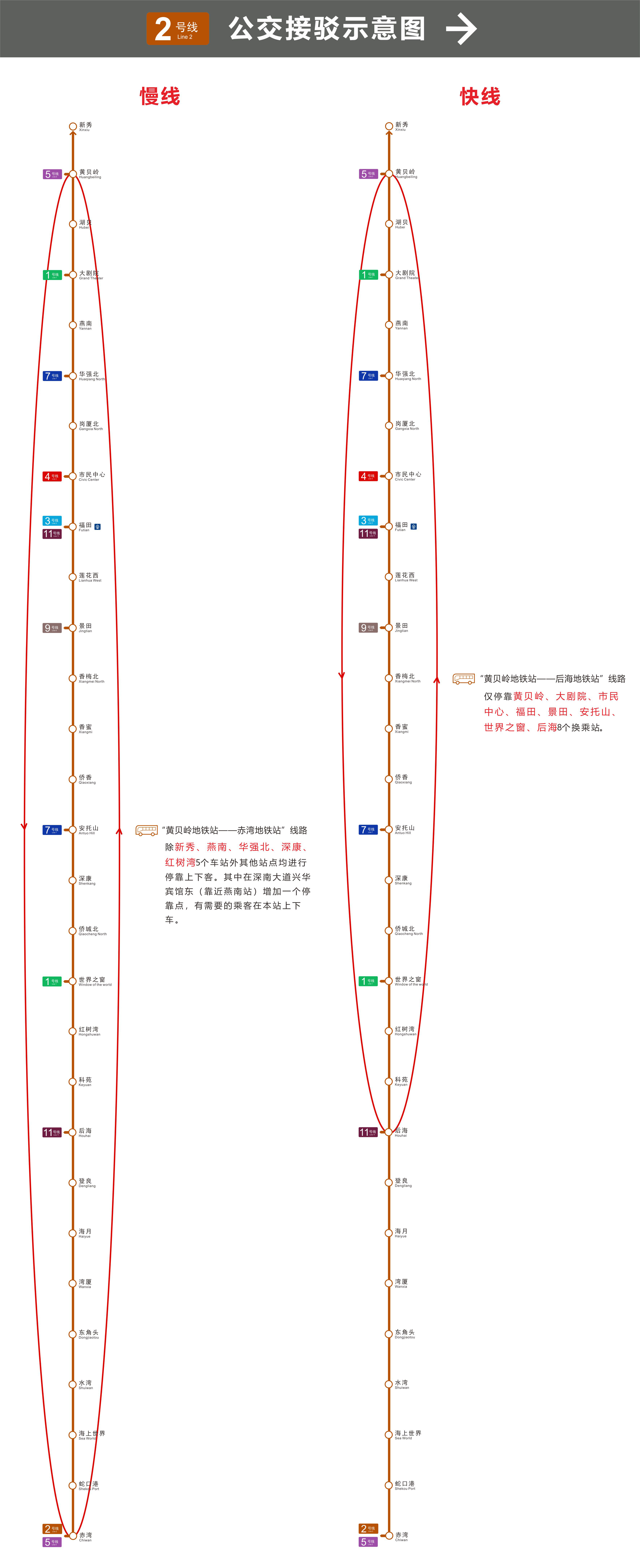 為了方便期間市民乘客的出行,屆時將組織循環(huán)開行2號線的兩條公交接駁線路。1、公交接駁慢線:“黃貝嶺站—赤灣站”。除新秀、燕南、華強北、深康、紅樹灣5個站點不停靠之外,其余各站均停靠上下客。2、公交接駁快線:“黃貝嶺站—后海站”。僅??奎S貝嶺、大劇院、市民中心、福田、景田、安托山、世界之窗、后海共8個換乘站。