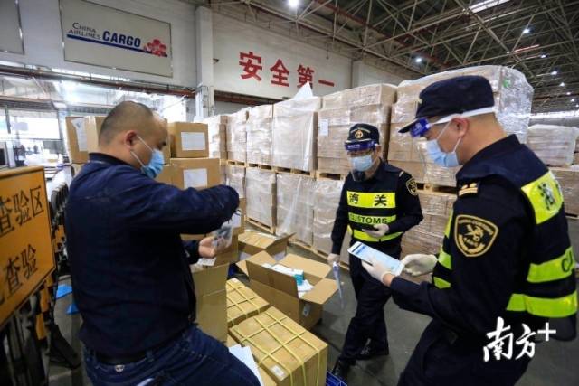 深圳海關(guān)保障深圳向國(guó)際友好城市捐贈(zèng)的抗擊疫情物資順暢通關(guān)。圖為海關(guān)人員正在檢查貨場(chǎng)防疫物資。南方日?qǐng)?bào)記者朱洪波攝