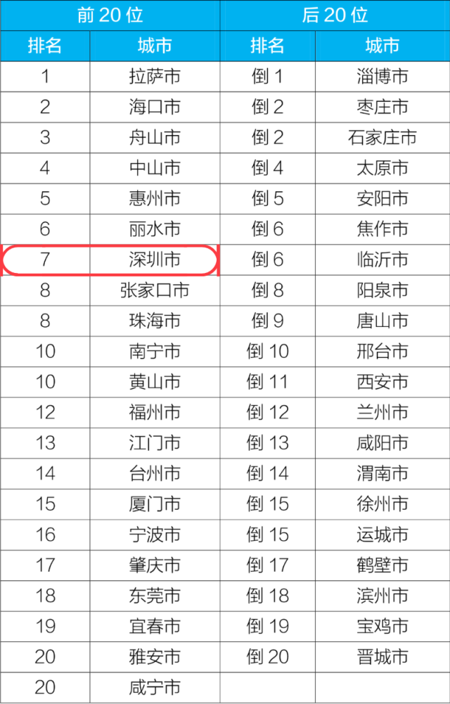 3月,168個重點城市中淄博、棗莊、石家莊市等城市空氣質量相對較差(從倒數(shù)第1名至倒數(shù)第20名);拉薩、海口、舟山市等城市空氣質量相對較好,深圳排名第7。