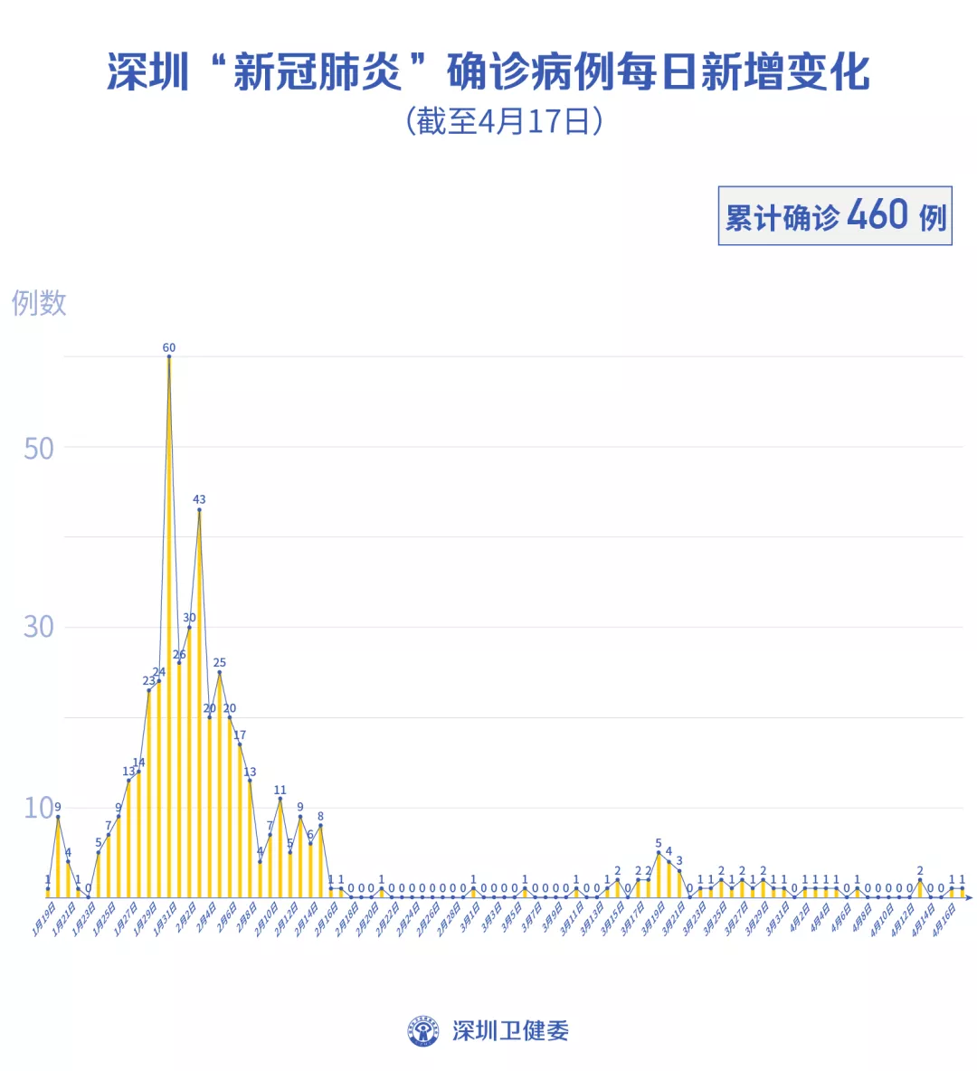 截至4月17日24時(shí),深圳累計(jì)報(bào)告新冠肺炎病例460例。4月17日當(dāng)天新增境內(nèi)病例1例。