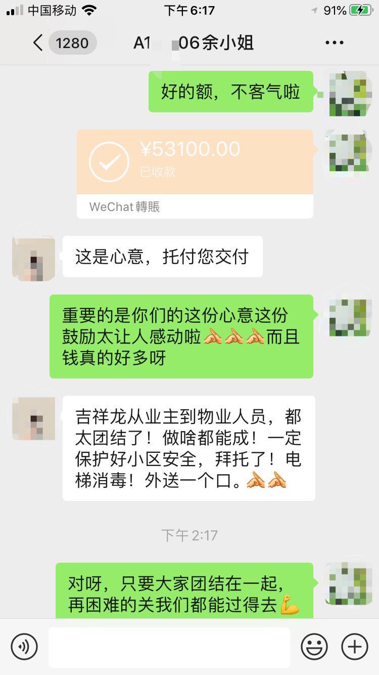 一天下來,吉祥龍小區(qū)共有156位愛心業(yè)主通過線上籌集款項(xiàng)53100元,最后以微信轉(zhuǎn)賬的形式轉(zhuǎn)給了吉祥龍小區(qū)服務(wù)中心負(fù)責(zé)人張經(jīng)理,并委托其轉(zhuǎn)交給堅(jiān)守在工作崗位的每一位物業(yè)員工手中。