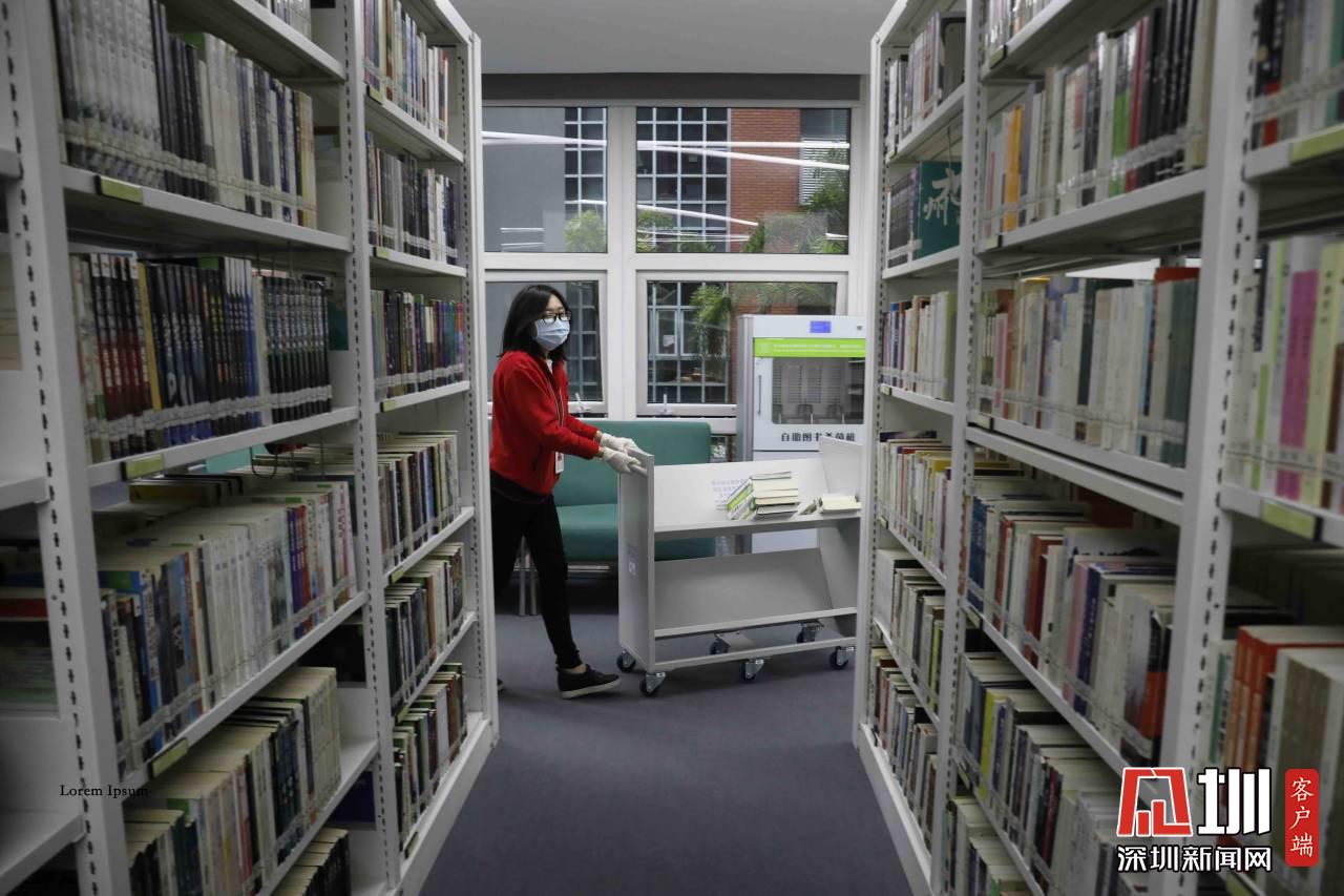 一位工作人員正在將需要上架的書(shū)籍推到指定位置。
