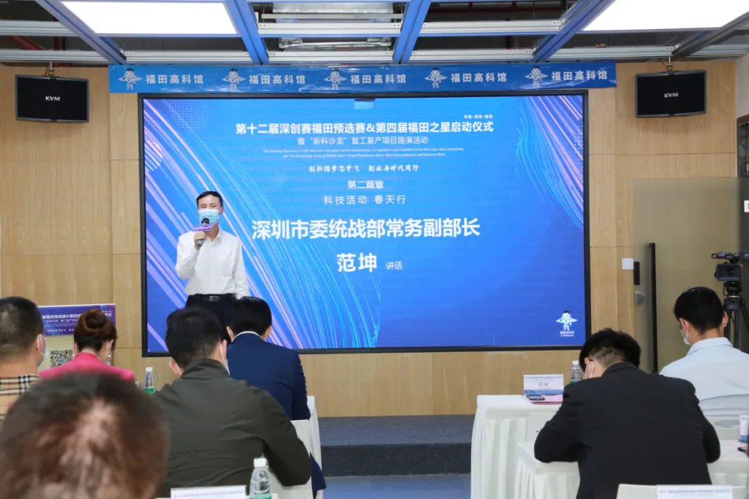 4月23日,由深圳市新聯(lián)會科技聯(lián)盟、福田高科館主辦的第十二屆深創(chuàng)賽福田預(yù)選賽&第四屆福田之星啟動儀式暨“新科沙龍”復(fù)工復(fù)產(chǎn)項目路演活動在福田高科館舉行,并進(jìn)行全程網(wǎng)絡(luò)同步直播。深圳市委統(tǒng)戰(zhàn)部常務(wù)副部長范坤出席活動。