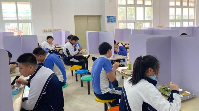 午餐時間,二實學生自帶飯盒,有序排隊,經過紅外線測溫儀,到食堂窗口就餐,然后到裝有隔板的餐桌就餐。
