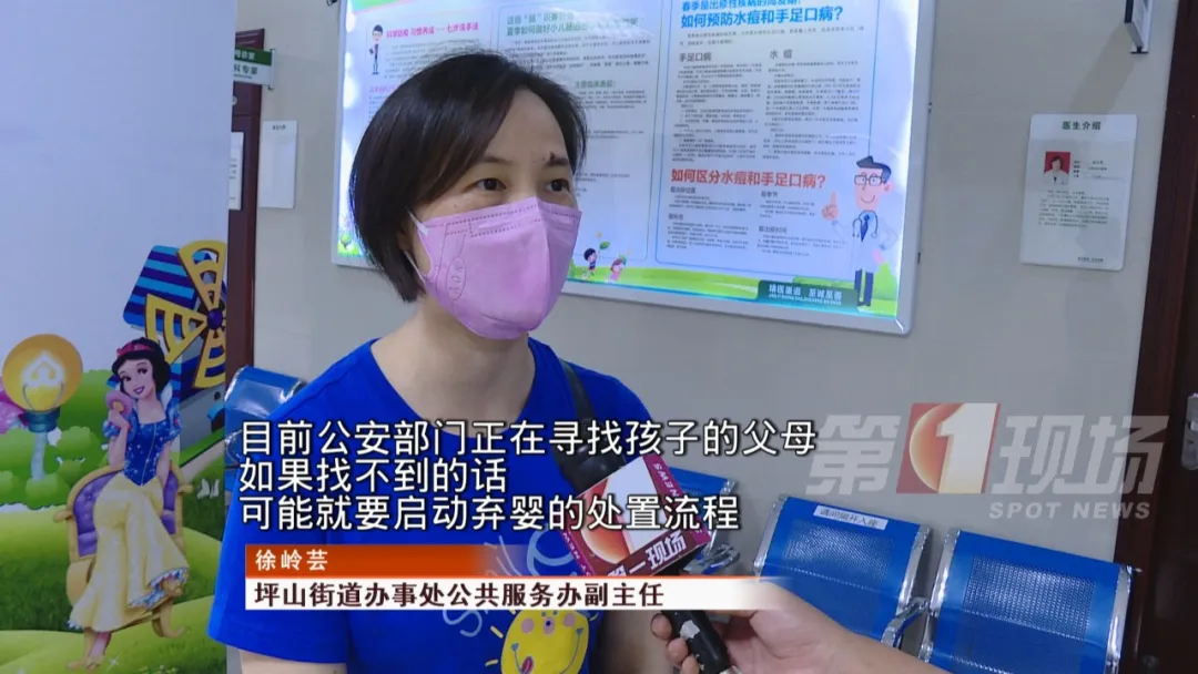 目前,孩子暫時由坪山街道的民政部門代為照料。工作人員表示,如果找不到孩子的父母的話,可能就要啟動棄嬰的處置流程。
