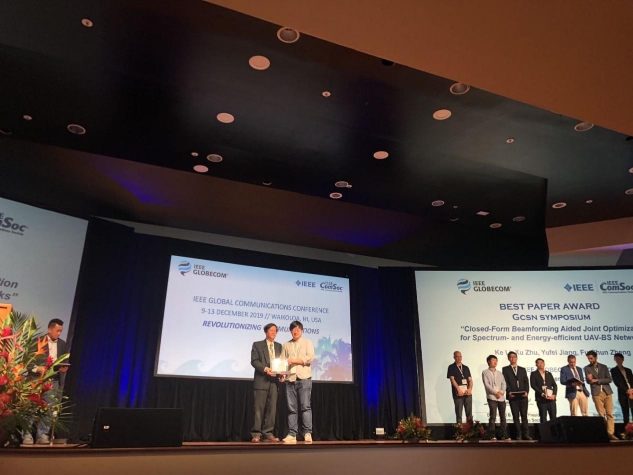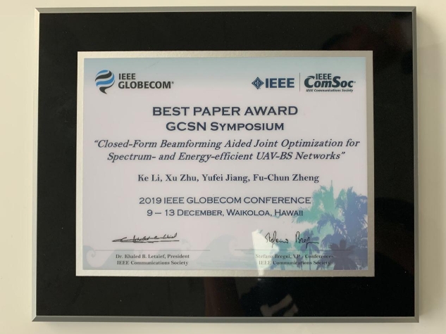 日前,由哈工大(深圳)電子與信息工程學(xué)院2017級碩士研究生李可擔(dān)任第一作者,朱旭教授、蔣宇飛助理教授、鄭福春教授為共同作者,哈工大(深圳)為第一通訊單位完成的論文《三維波束成形輔助的高譜效和能效的無人機基站網(wǎng)絡(luò)的聯(lián)合優(yōu)化》(“Closed-Form Beamforming Aided Joint Optimization for Spectrum- and Energy-Efficient UAV-BS Networks”)入選通信領(lǐng)域頂級會議Globecom2019 (IEEE Global Communications Conference2019),并獲得最佳論文獎。