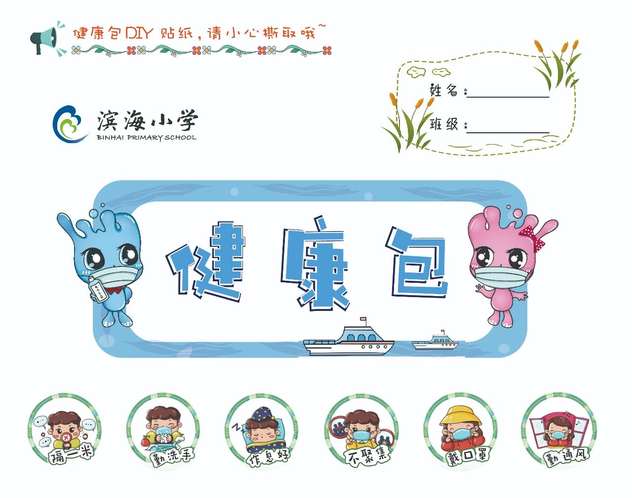 《健康包》,也是學(xué)校精心為返校的學(xué)生準備的一份健康防疫小禮包,里面有臂貼、DIY貼紙等!這些萌萌的DIY貼紙,可以根據(jù)孩子們的個性需求和遵守情況,自由拼貼!學(xué)校通過這些充滿童趣的設(shè)計,讓孩子們將防護措施牢記于心!
