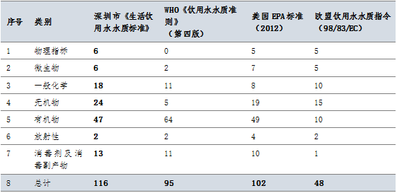 表1、深圳市生活飲用水水質(zhì)標準與其他的標準的比較