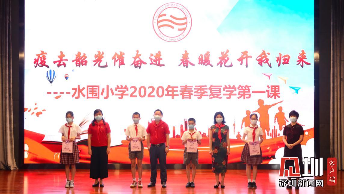 據(jù)悉,水圍小學(xué)“復(fù)學(xué)典禮”上午8:40正式開始,出席的嘉賓有福田區(qū)教科院教研員、少先隊(duì)總輔導(dǎo)員李楠、衛(wèi)生健康副校長明昭。各班級(jí)的學(xué)生則帶著口罩,單人單桌在教室內(nèi),以觀看直播的方式參加典禮。