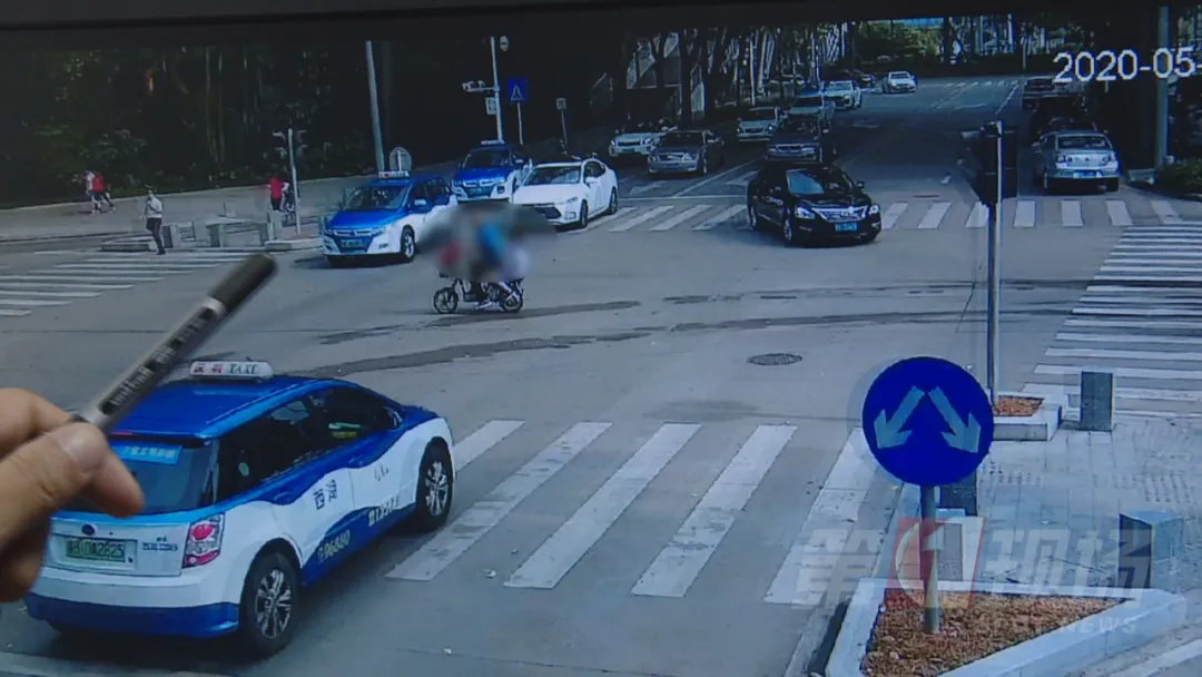 5月12日下午,在南山外國(guó)語(yǔ)學(xué)校科苑小學(xué)與南山外國(guó)語(yǔ)學(xué)校中間路段,一位老人騎電單車,載著一名小學(xué)女生,沿著高新南環(huán)路由西往東方向行駛。
