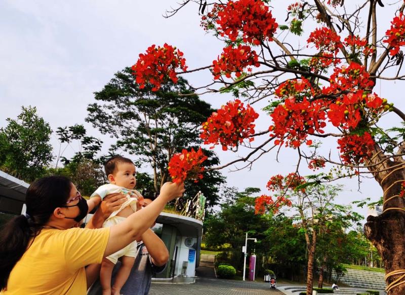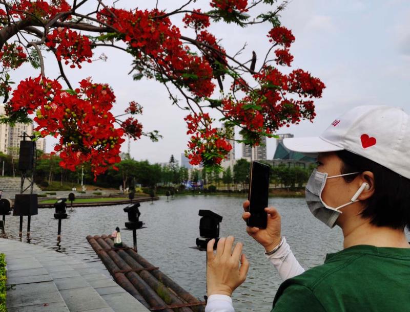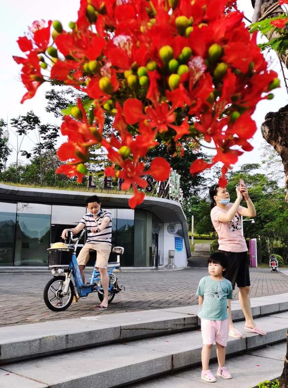 鳳凰木又名火樹、紅花楹,由于其開花時"葉如飛凰之羽,花若丹鳳之冠",因而得名「鳳凰樹」。每年5月至7月,是鳳凰樹開花的時節(jié)。在鵬城公園、道路兩旁到處可見鳳凰花盛開,當(dāng)下鳳凰花開正燦爛,錦簇花團紅似火,成為鵬城亮麗的風(fēng)景線。圖為龍崗大運中心鳳凰樹花開吸引市觀賞拍照。
