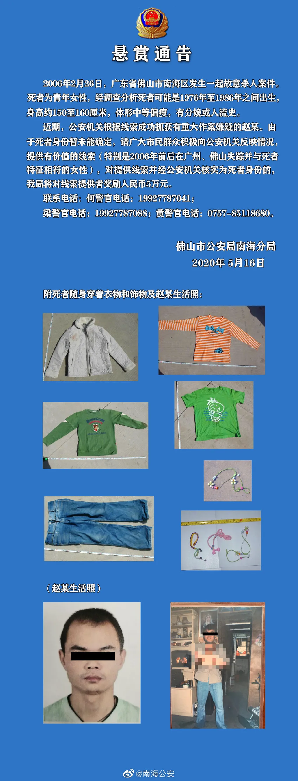 近期,公安機(jī)關(guān)根據(jù)線索成功抓獲有重大作案嫌疑的趙某。由于死者身份暫未能確定,請廣大市民群眾積極向公安機(jī)關(guān)反映情況,提供有價(jià)值的線索(特別是2006年前后在廣州、佛山失蹤并與死者特征相符的女性),對提供線索并經(jīng)公安機(jī)關(guān)核實(shí)為死者身份的,將對線索提供者獎(jiǎng)勵(lì)人民幣5萬元。