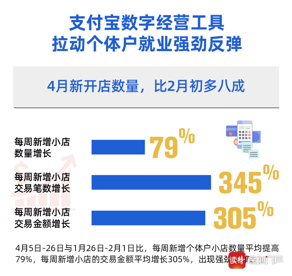 北京大學數(shù)字金融研究中心通過分析支付寶最新數(shù)據(jù)發(fā)現(xiàn),與疫情中最低點相比,全國個體戶就業(yè)形勢已出現(xiàn)強勁反彈:隨著復工復產(chǎn)的全面推進和消費券的發(fā)放,4月以來與疫情最低點2月1日當周相比,每周新增個體戶小店數(shù)量平均提高79%,每周新增小店的交易金額平均增長305%。