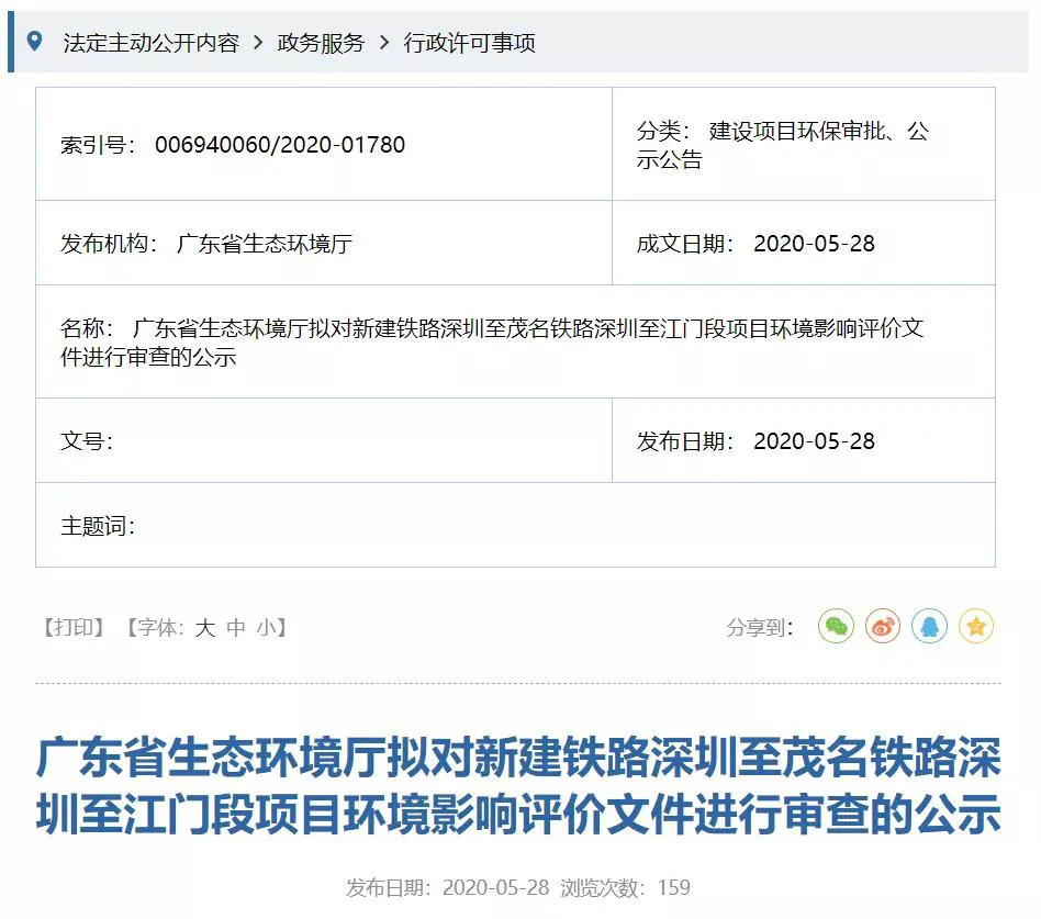 5月28日,廣東省生態(tài)環(huán)境廳發(fā)布擬對(duì)新建鐵路深圳至茂名鐵路深圳至江門(mén)段項(xiàng)目環(huán)境影響評(píng)價(jià)文件進(jìn)行審查的公示,這意味著項(xiàng)目前期工作接近尾聲,距離開(kāi)工又進(jìn)了一步。
