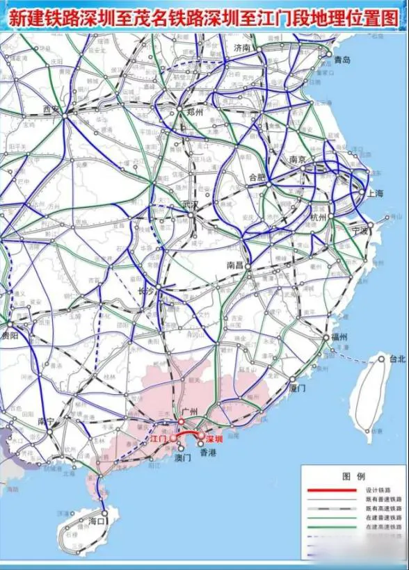 新建鐵路深圳至茂名鐵路深圳至江門(mén)段正線從深圳樞紐西麗站(規(guī)劃)引出,經(jīng)深圳市、東莞、南沙區(qū),中山、江門(mén),引入深茂鐵路江門(mén)至茂名段江門(mén)站(在建)。