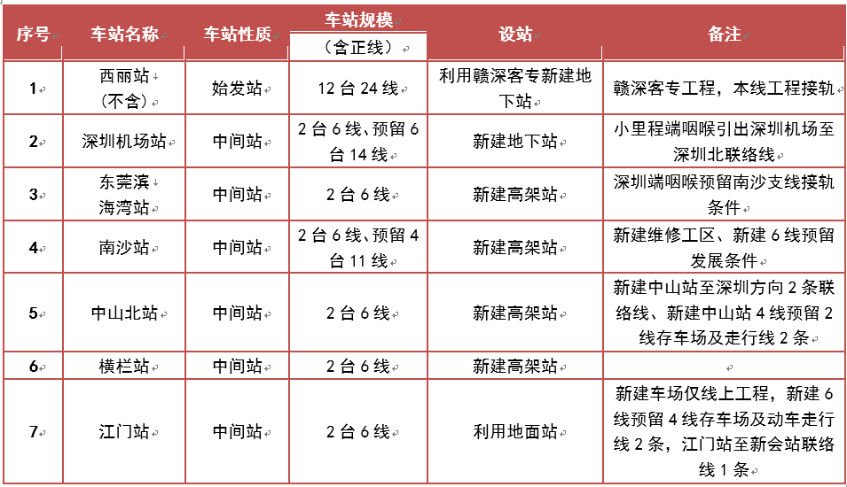 項目共設(shè)西麗(不含)、深圳機(jī)場、濱海灣、南沙、中山北、橫欄、江門等7個車站,其中西麗、深圳機(jī)場為地下站,濱海灣、南沙、中山北、橫欄為高架站,江門站為地面站。