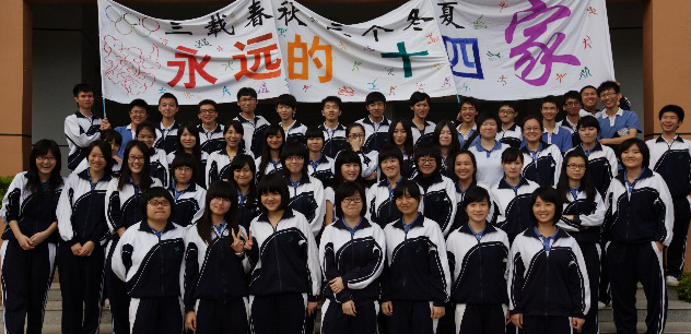 有一年校運(yùn)會(huì),張老師所帶的2008級(jí)14班的入場解說詞中,有這樣一句:“看,高三‘十四家’的方隊(duì)意氣風(fēng)發(fā)地走過來了,他們代表這個(gè)大家庭的59名成員……”