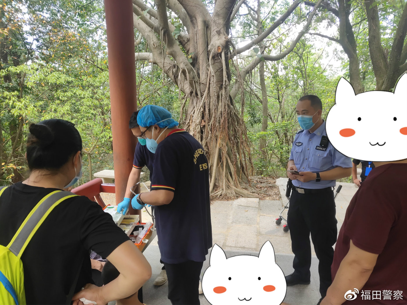 13時許,接派出所前臺指令,報稱一老人身體不適請求幫助后,民警立即趕到現(xiàn)場,協(xié)助120醫(yī)務(wù)人員進行檢查。檢查完畢后,民警為老人遞上一杯水,并在確認老人身體無礙后,將其護送下山。