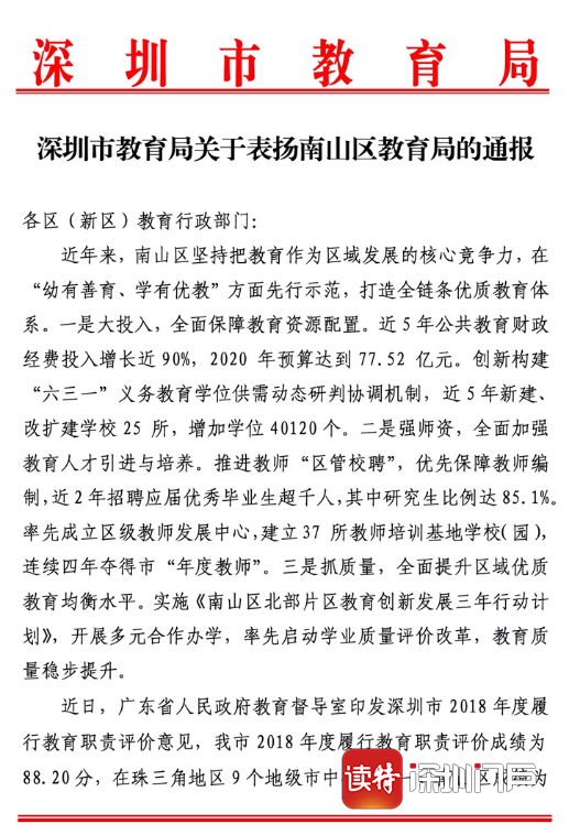 見圳客戶端·深圳新聞網(wǎng)2020年7月1日訊(深圳特區(qū)報(bào)記者 李麗)6月30日,《深圳市教育局關(guān)于表揚(yáng)南山區(qū)教育局的通報(bào)》在全市教育界引起關(guān)注。通報(bào)表示,近日,廣東省人民政府教育督導(dǎo)室印發(fā)深圳市2018年度履行教育職責(zé)評價(jià)意見,深圳2018年度履行教育職責(zé)評價(jià)成績?yōu)?8.20分,在珠三角地區(qū)9個地級市中排名第一,其中,南山區(qū)成績?yōu)?8.64分,在珠三角地區(qū)48個縣(市、區(qū))中排名第一。經(jīng)研究,決定在全市教育系統(tǒng)對南山區(qū)教育局給予通報(bào)表揚(yáng),并希望南山區(qū)教育局率先建成全國義務(wù)教育優(yōu)質(zhì)均衡發(fā)展區(qū)。