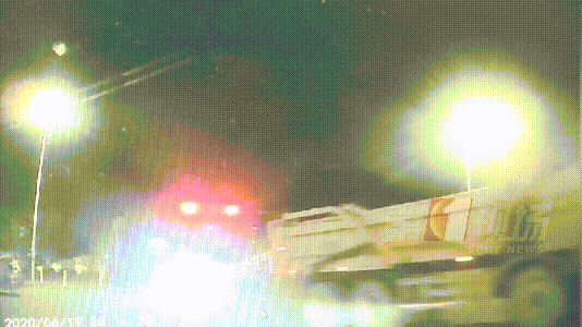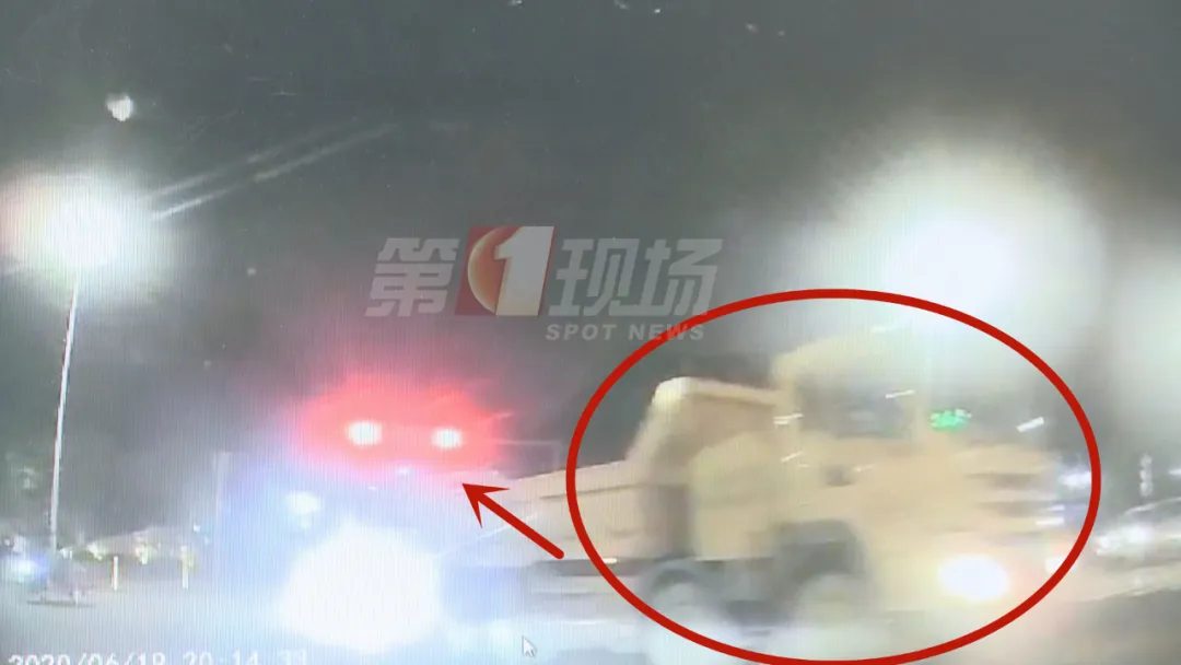 事故發(fā)生在6月19號(hào)晚上8點(diǎn)多,可以看到黑色小車在信號(hào)燈開始閃爍的時(shí)候開過光僑路路口,正好被一輛左轉(zhuǎn)泥頭車擋住了路。