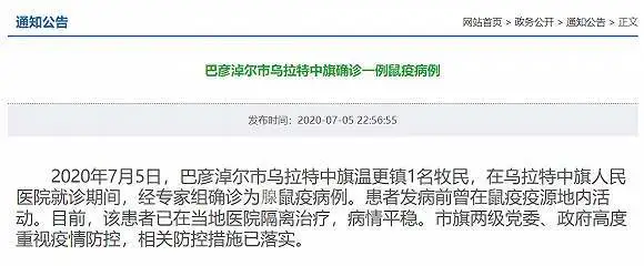 7月5日傍晚,內(nèi)蒙古巴彥淖爾市衛(wèi)生健康委員會發(fā)布通告稱,烏拉特中旗人民醫(yī)院報告了1例疑似腺鼠疫病例,經(jīng)研究決定,于7月5日發(fā)布鼠疫防控Ⅲ級預(yù)警。當天晚間,巴彥淖爾市衛(wèi)生健康委員會再次發(fā)布通告稱,該市烏拉特中旗確診一例鼠疫病例。