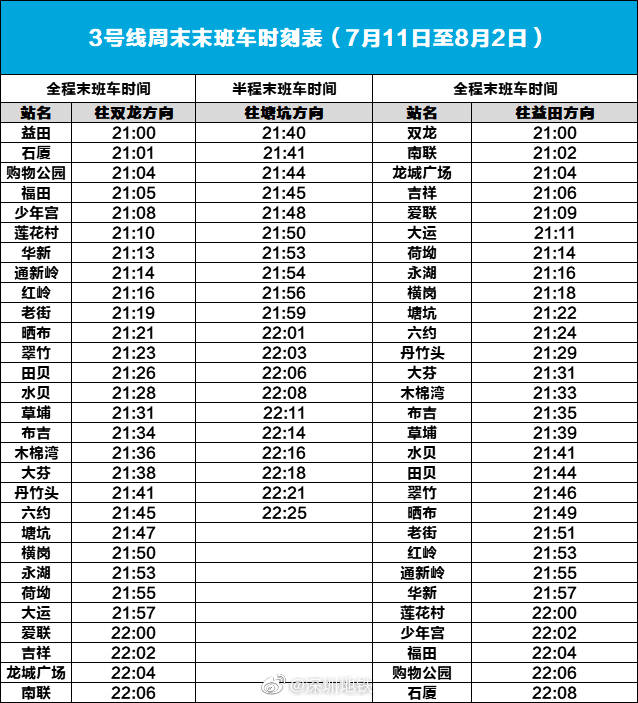 見圳客戶端?深圳新聞網(wǎng)2020年7月8日訊(見圳客戶端、深圳新聞網(wǎng)記者 陳致遠(yuǎn))記者從深圳地鐵了解到,為配合新線開通,7月11日至8月2日的每周六、周日,深圳地鐵3號(hào)線將于21時(shí)提前結(jié)束運(yùn)營。其他地鐵線路正常運(yùn)營。