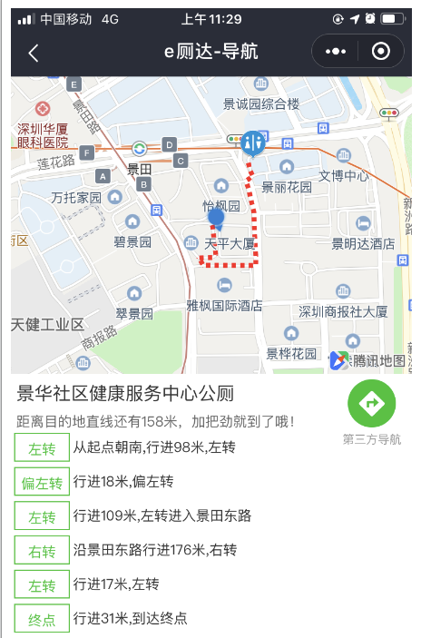 第三個功能為導(dǎo)航找?guī)<热灰呀?jīng)查看到周邊有廁所分布,怎能不知道具體線路呢?“e廁達(dá)”中的“帶我去”按鈕可以輕松引領(lǐng)你去往定位的公廁。