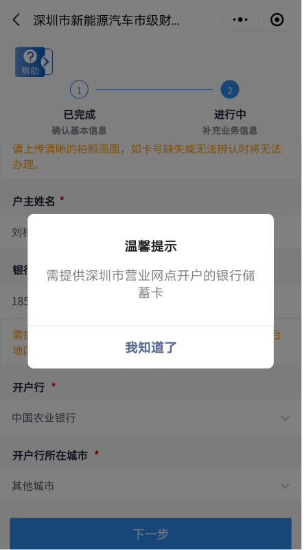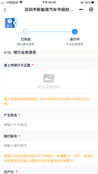 客戶需上傳銀行卡照片,并填寫銀行賬號(hào)、開戶行信息。開戶行如不在選項(xiàng)范圍內(nèi)可選擇“其他”自填。其中,銀行賬號(hào)需為深圳市營業(yè)網(wǎng)點(diǎn)開戶的銀行一類儲(chǔ)蓄卡,華僑、港澳臺(tái)地區(qū)居民及外國人需提供深圳市建設(shè)銀行一類儲(chǔ)蓄卡。