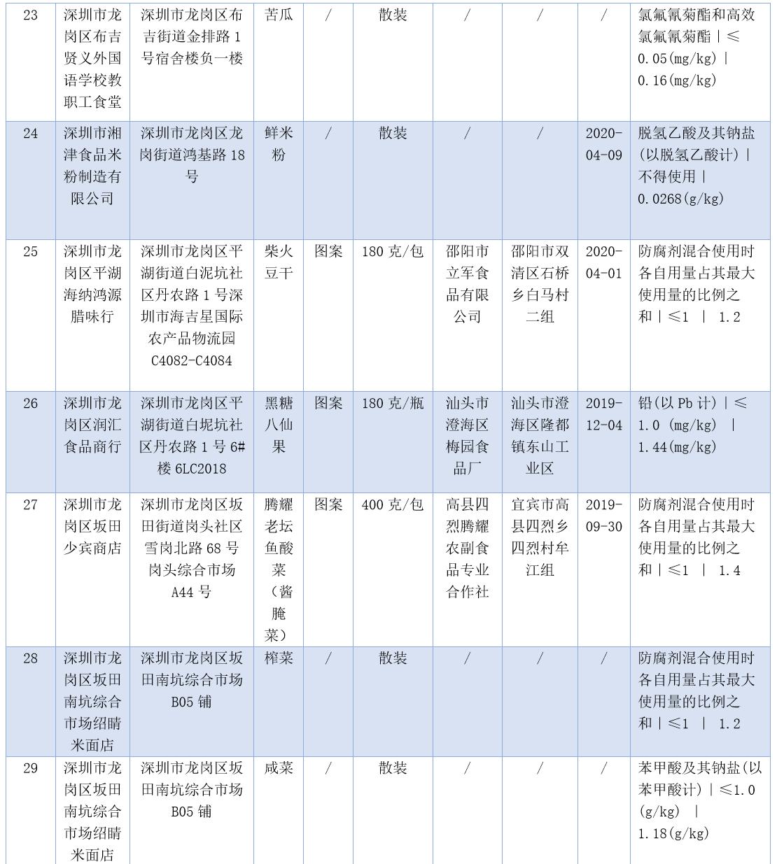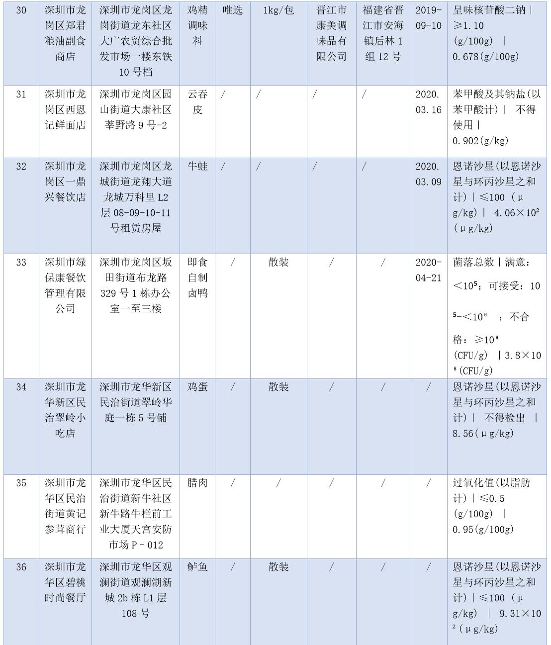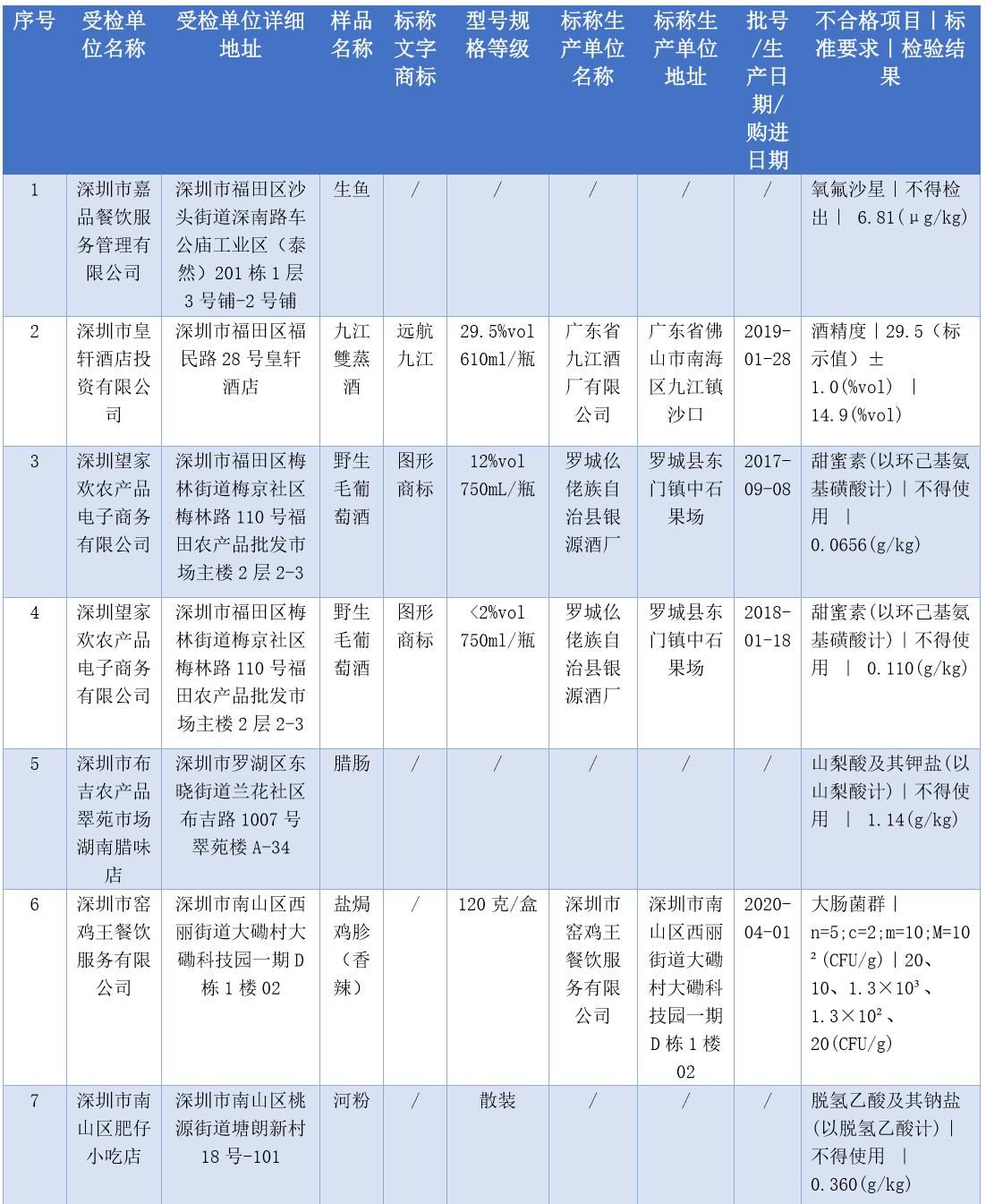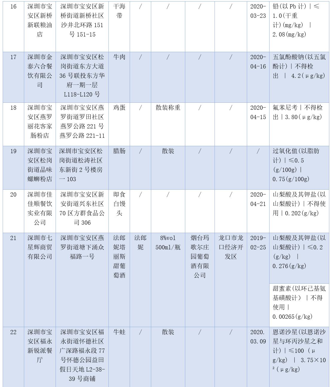 見(jiàn)圳客戶端·深圳新聞網(wǎng)2020年7月17日訊(晶報(bào)記者 鄧裴裴/制圖)7月17日,深圳市市場(chǎng)監(jiān)督管理局官網(wǎng)發(fā)布了2020年第二十二期食品安全抽樣檢驗(yàn)情況通報(bào),3-5月,共抽檢生產(chǎn)、流通、餐飲環(huán)節(jié)食品1229批次,發(fā)現(xiàn)不合格樣品47批次。記者注意到,不少不合格樣品抽檢單位為餐飲店,包括皇軒酒店、窯雞王、愛(ài)上牛蛙、御可奶茶等,還有些小吃店、腸粉店、螺獅粉店紛紛上榜。涉及不合格項(xiàng)目類別包括農(nóng)藥殘留、獸藥殘留、食品添加劑、微生物污染、品質(zhì)指標(biāo)、金屬等元素污染物。
