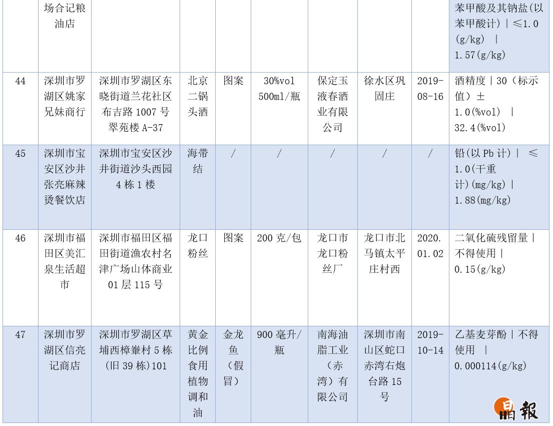 本次不合格樣品涉及的食物種類較多,臘腸、雞蛋、榨菜、酒等都檢出問(wèn)題,值得注意的是,羅湖區(qū)草埔西樟輋村信亮記商店出售假冒的金龍魚(yú)油,檢出了不得使用的乙基麥芽酚,其標(biāo)稱生產(chǎn)企業(yè)為南山區(qū)南海油脂工業(yè)(赤灣)有限公司,后經(jīng)核實(shí),不合格產(chǎn)品非該公司生產(chǎn)。