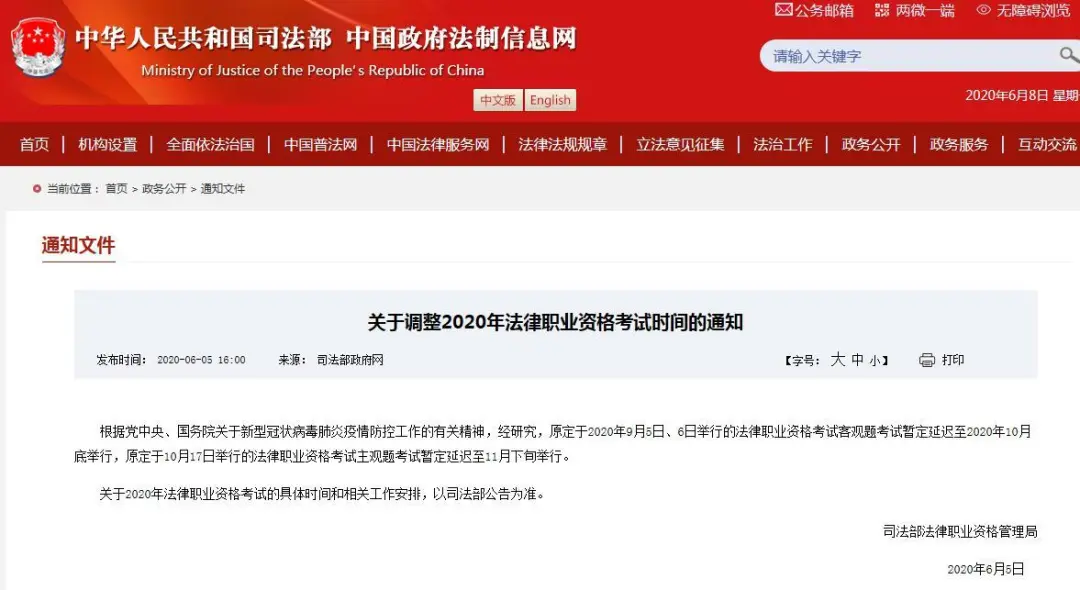 司法部法律職業(yè)資格管理局6月5日發(fā)布通知,根據(jù)黨中央、國(guó)務(wù)院關(guān)于新型冠狀病毒肺炎疫情防控工作的有關(guān)精神,經(jīng)研究決定,原定于2020年9月5日、6日舉行的法律職業(yè)資格考試客觀題考試暫定延遲至2020年10月底舉行,原定于10月17日舉行的法律職業(yè)資格考試主觀題考試暫定延遲至11月下旬舉行。具體考試時(shí)間和相關(guān)工作安排,以司法部公告為準(zhǔn)。