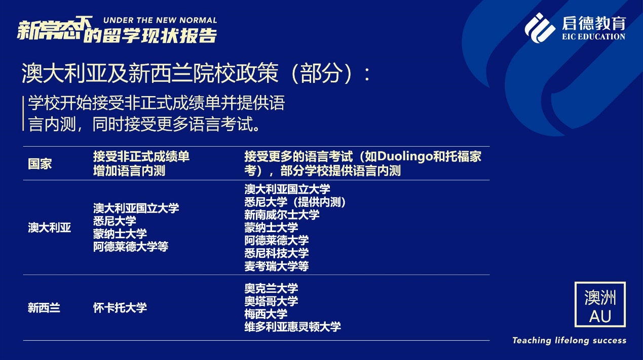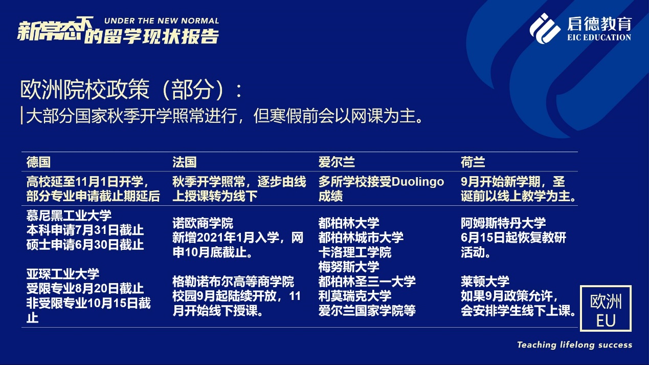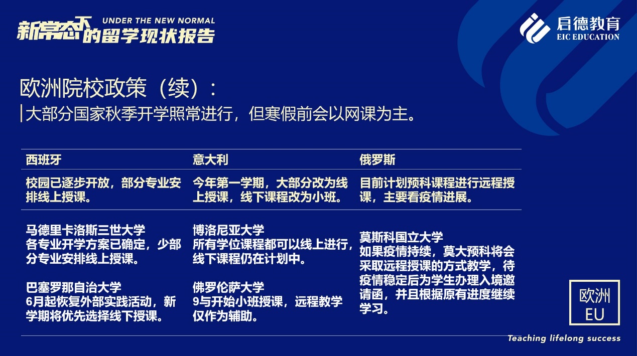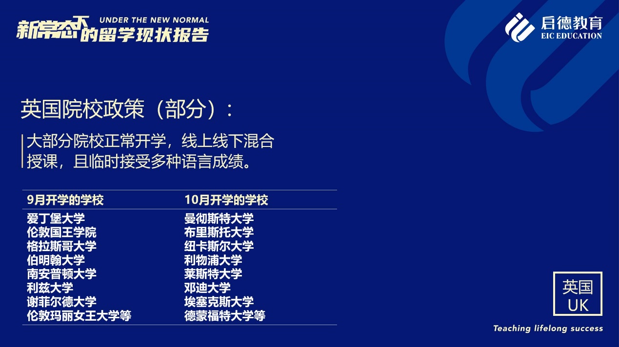 《報告》也梳理了近期各主要留學(xué)目的國及院校針對國際學(xué)生出臺的各類政策。據(jù)啟德留學(xué)英愛項目總監(jiān)孫波介紹,國內(nèi)英國簽證中心已經(jīng)重新開放。準備赴英讀研的學(xué)生,部分大學(xué)明確表示秋季可以正常開學(xué),大課將會采用線上授課的方式,小班授課線下進行;還有部分大學(xué)向?qū)W生提供更加靈活的入讀方案,學(xué)生可以選擇9月入讀或者1月入讀。此外,從2021年開始,在英國完成博士學(xué)位的國際學(xué)生將會獲得3年有效期的 PSW工作簽證,本科生和碩士生可以獲得2年有效期的 PSW工作簽證。