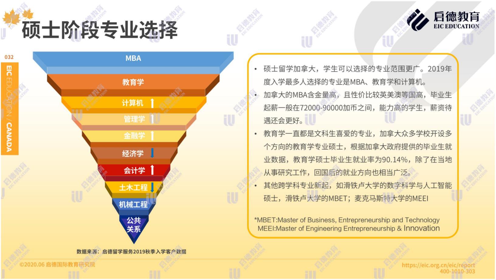 啟德加拿大2019秋季入學(xué)客戶服務(wù)數(shù)據(jù)顯示,在本科階段專業(yè)選擇理工科占比42%,商科占比37.1 %,文科19.1%,理工科的申請人數(shù)超過了商科。碩士階段選擇最多的專業(yè)是 MBA、教育學(xué)和計算機,其他新興的跨學(xué)科專業(yè)包括滑鐵盧大學(xué)的數(shù)字科學(xué)與人工智能專業(yè)和商業(yè)、創(chuàng)業(yè)和技術(shù)專業(yè)( MBET ),麥克馬斯特大學(xué)的工程、創(chuàng)業(yè)與創(chuàng)新專業(yè)( MEEI )。