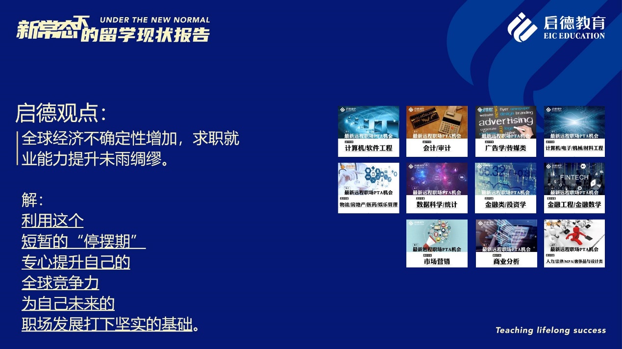 啟德留學(xué)美研項目總監(jiān)金鑫建議,對于正在準備留學(xué)申請、求職就業(yè)的同學(xué)來說,在密切關(guān)注相關(guān)國家與院校政策的同時,不妨利用這段時間參加線上科研項目,或是參加遠程實習(xí)及遠程 PTA ( Part-Time Assistant )項目,豐富學(xué)術(shù)或職場經(jīng)歷,為留學(xué)申請和求職就業(yè)積累背景、提高競爭力。