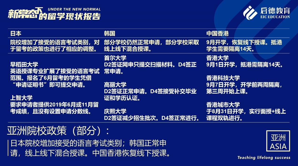 日本2020年入學(xué)學(xué)生的在留資格均已下發(fā),但針對留學(xué)生的入境政策目前還未最終公布。新加坡公立院校的新生留學(xué)簽證已正常批復(fù);私立院校的新生可以提交申請,但暫緩受理。據(jù)啟德留學(xué)亞洲項目總監(jiān)李陽介紹,中國香港、中國澳門地區(qū)秋季各院校均計劃如期復(fù)課,以網(wǎng)課+面授的形式完成第一學(xué)期課程。