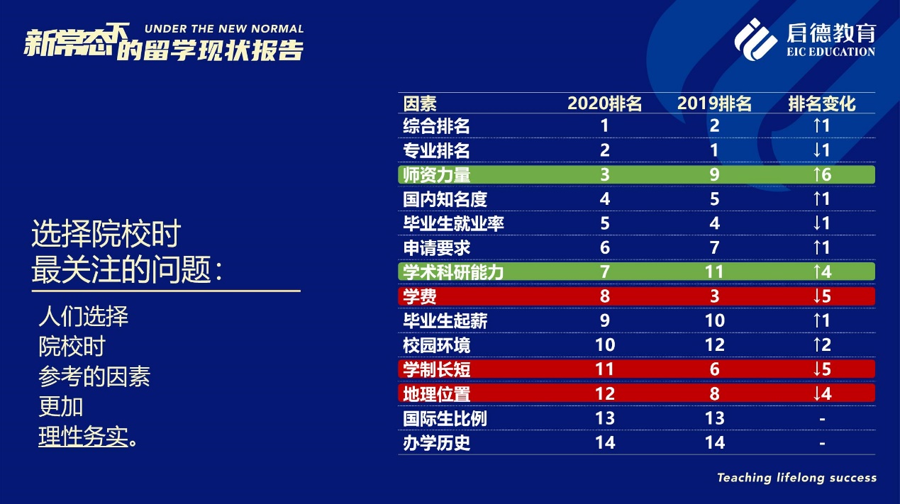 值得關(guān)注的是,在“選擇院校時最關(guān)注的問題”中,“師資力量”的受關(guān)注度從2019年的第9位上升為第3位,僅次于“綜合排名”與“專業(yè)排名”,“國內(nèi)知名度”與“畢業(yè)生就業(yè)率”分居第4位與第5位,“學(xué)術(shù)科研能力”從2019年的第11位上升至第7位,而“學(xué)費”、“學(xué)制長短”與“地理位置”等因素分別下滑至第8位、第11位與第12位??梢娫诰蜆I(yè)形勢尤其嚴峻的2020年,意向留學(xué)生對教育質(zhì)量的剛性需求已進一步上升,以期在未來的就業(yè)市場獲得更具戰(zhàn)略優(yōu)勢的國際競爭力。